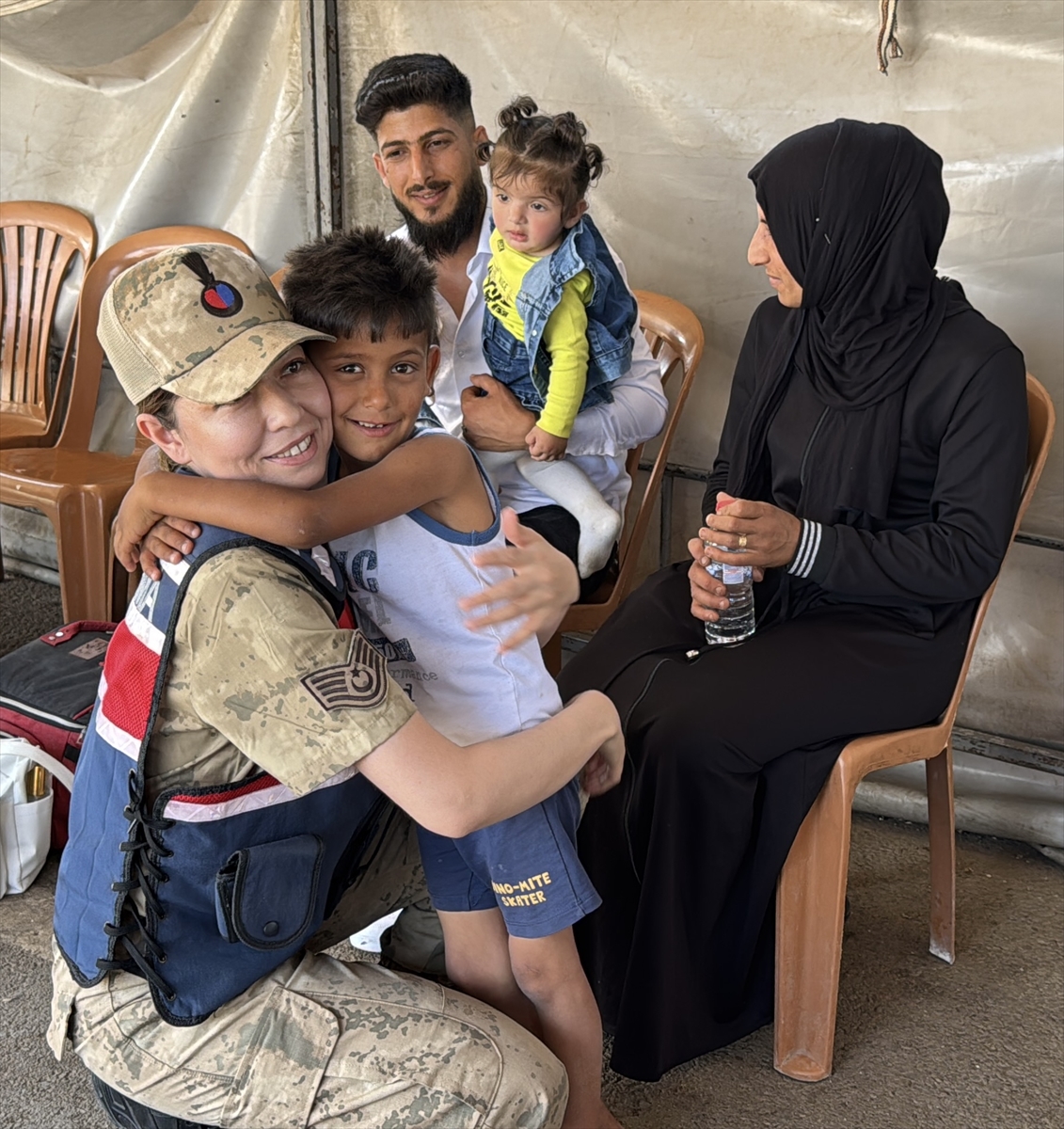 Kadın jandarma personeli de ailelerinin işlemlerini tamamlamasını bekleyen çocuklarla yakından ilgileniyor, ikramlarda bulunuyor.