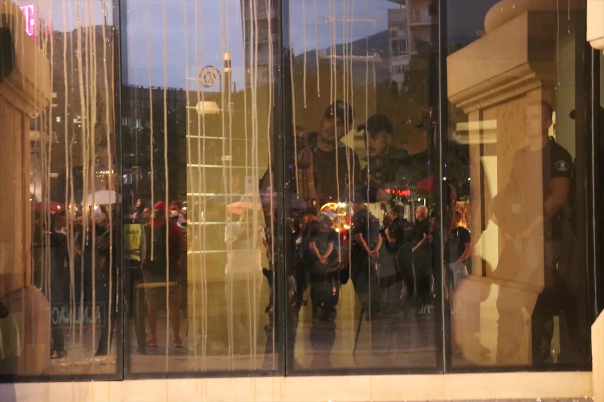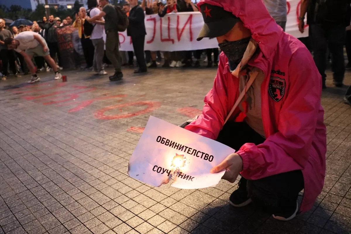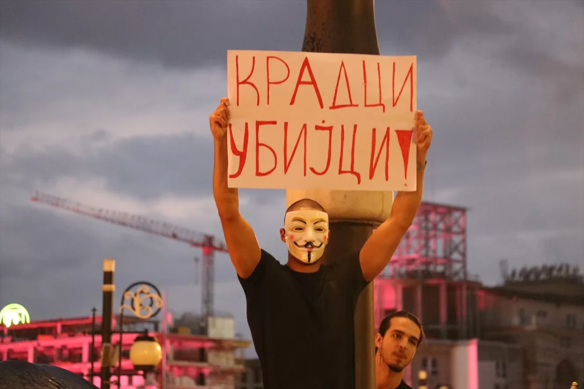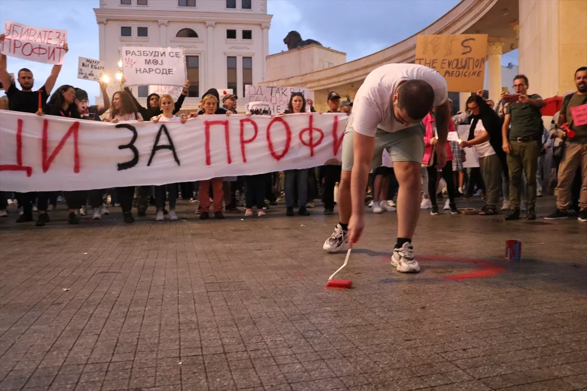 Hükümet binası önünde toplanan gruptakiler, Kuzey Makedonya Başbakanı Dimitar Kovaçevski ve Sağlık Bakanı Fatmir Mexhiti'nin istifasını talep etti.