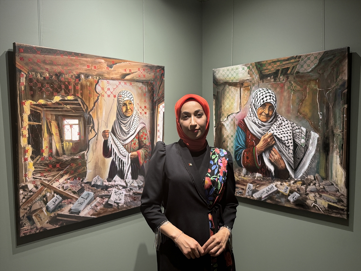 "Bu sergide daha çok Anadolu kadınlarının sessiz yankılarına değiniyoruz. Bu eserde kaybolmakta olan bir kültür olduğu için değil, bomba seslerinden onları duyamadığımız için Filistinli kadınları çizmek istedim. Eserde yıkık bir evde Filistinli kadınlar ve içerisinde taşlar var. Bu taşların bir kısmını da sergide görüyoruz. Bu noktada aslında seyirciye sorgulatmak istediğim şeyler var. Yani bu taşların neden burada olduğu ya da neden yerinde olmadığı gibi. Eserin ismi ise Filistin'li bir kadının söylediği 'unutmayacağız' sözünden ortaya çıktı."