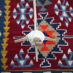 "Düğüm atmaya çalışırdım. Annem nereye hangi renkten ne kadar dokunacaksa söyler ben o arasını doldururdum. Annem ben üniversiteyi bitirene kadar halı dokumaya devam etti, halı parasıyla okudum. Ufak tefek tezgahlarla yıllardır dokuma yapıyordum ama bir zaman sonra o minik dokumalar beni doyurmamaya başladı. Bence halı öyle küçücük dokunup masanın üstüne, duvara asmak yerine yere serilmeli. Ben evimin yerine serilecek bir şey dokumalıyım düşüncesiyle kocaman bir tezgah yaptım kendime. Eski tezgahlardan yola çıkarak daha hafifini yaptım. 7-8 yıldır böyle devam ediyorum. Bu tezgahta dokuduğum en büyük kilim 180 santime 3 metre büyüklüğünde."