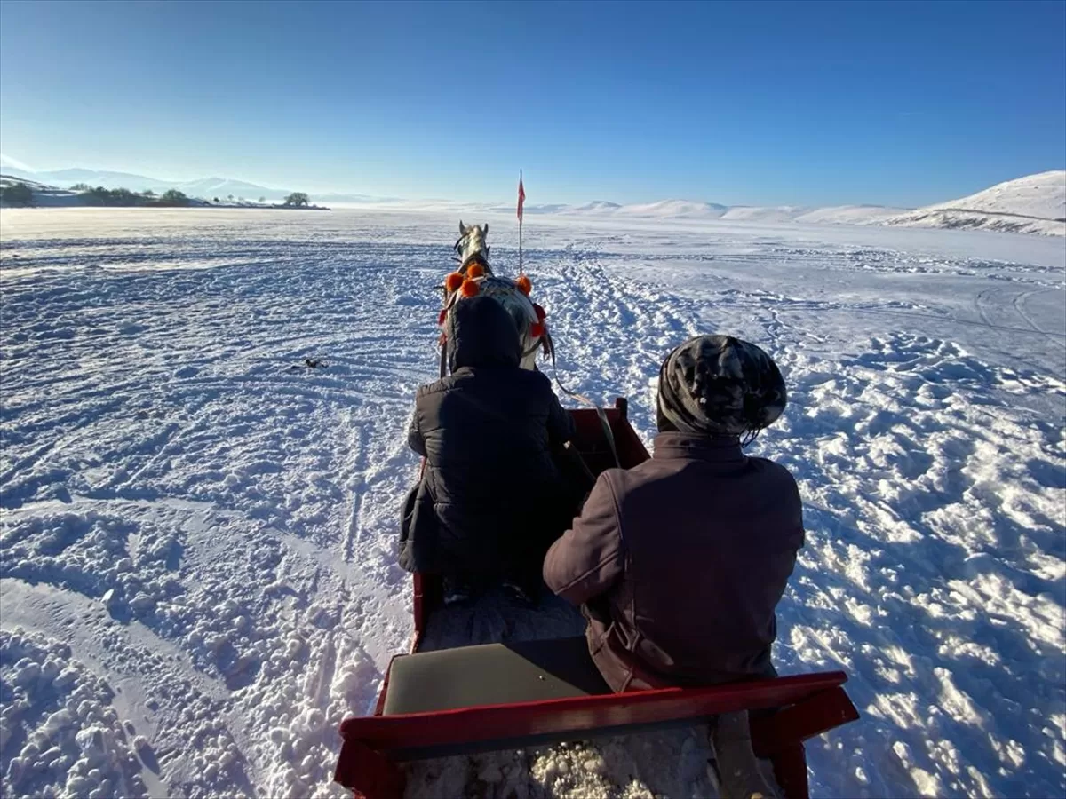Gölün, Ardahan tarafındaki kıyı kesimlerine gelen yerli ve yabancı turistler, buzla kaplı göl üzerinde yürüyüş yapıp, atlı kızaklarla gezinti yapıyor.