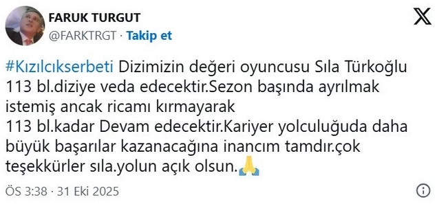 Turgut X hesabı üzeirnden yaptığı açıklamada, “Dizimizin değerli oyuncusu Sıla Türkoğlu, 113. bölümde diziye veda edecektir. Sezon başında ayrılmak istemiş ancak ricamı kırmayarak 113. bölüme kadar devam edecektir” ifadelerini kullandı.