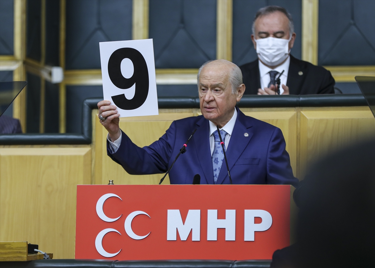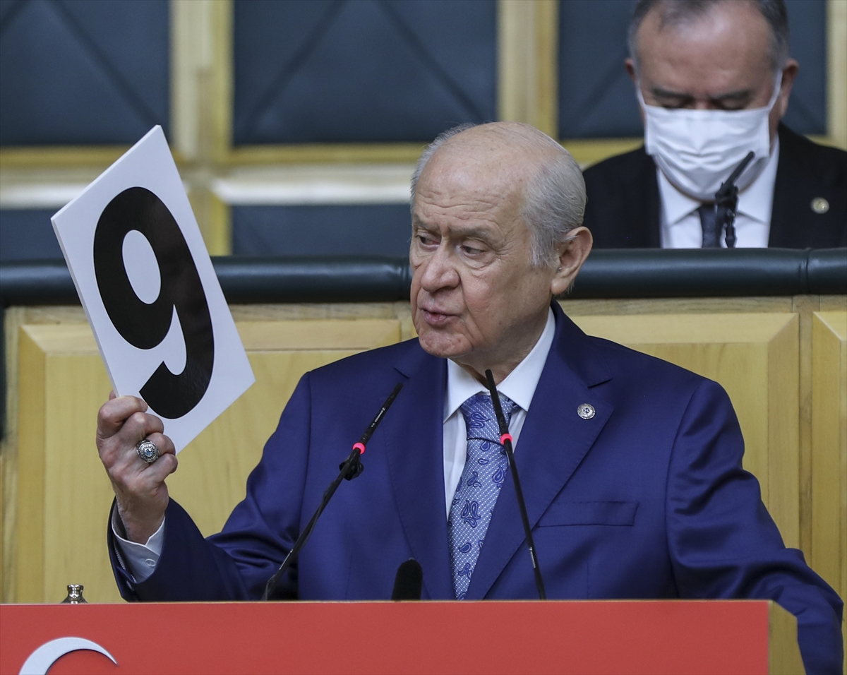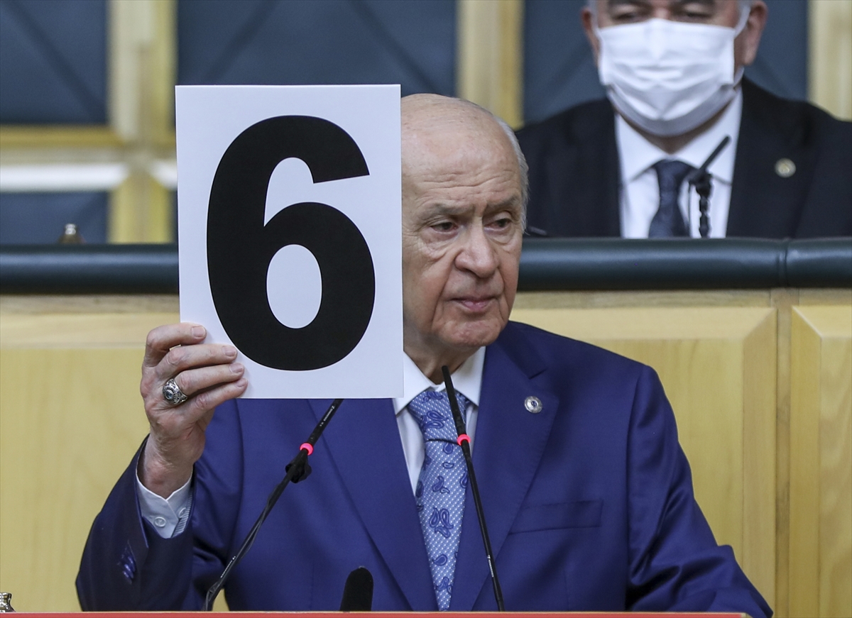 Kürsüde elinde 6 yazan bir tabela gösteren Bahçeli, "6 rakamına lütfen dikkat buyurunuz. Bu rakamı ters çevirdiğimizde tabiatıyla 9 rakamı ortaya çıkar. Mesele bakmak değil, görmek, görüleni tüm berraklığıyla göstermektir. Biz 6'ya bakınca gördüğümüz 6 oktur, yuvarlak masa çevresinde kurulan tuzaktır, tertiptir, tezgahtır, karamsarlıktır, kumpastır, Türkiye'nin sırtına bindirilmek istenen ağır külfettir. 6'yı çevirip 9 rakamına bakınca da gördüğümüz huzurdur, havaya kaldırılan 9 tuğdur, parlayan 9 ışıktır, sosyal ve ekonomik sorunların süratle geçeceğinin müjdesidir, Cumhur İttifakı'nın 2023'te açık ara öne geçeceğinin simgesidir. Nitekim çoğu gitmiş azı kalmıştır." diye konuştu.