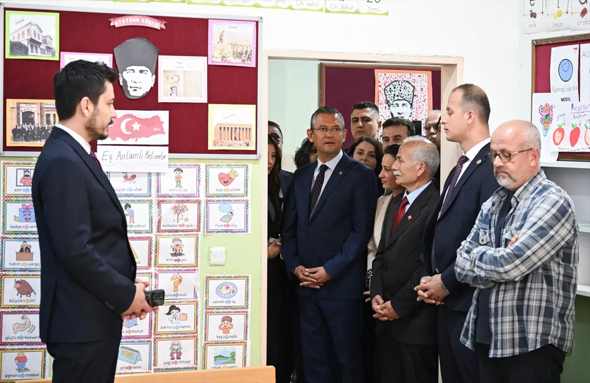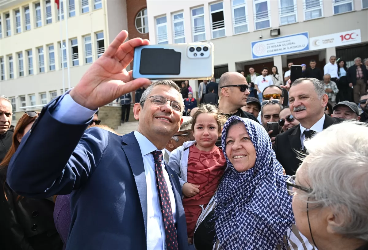 Eşi Didem, kızı İpek Özel ile 23 Nisan Ulusal Egemenlik İlkokulu'na gelen Özgür Özel, okul bahçesinde vatandaşlarla sohbet etti.