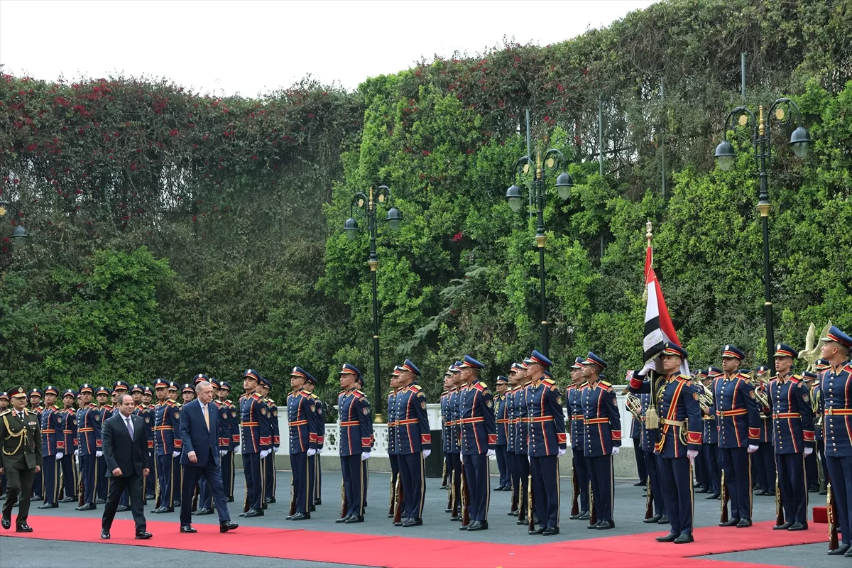 Mevkidaşı Sisi ile tören kıtasını denetleyen Erdoğan, askerleri selamladı. İki lider tokalaşarak basın mensuplarına poz verdi.