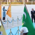 Tarihte kurulan 16 Türk devletini temsil eden bayraklar ve askerlerin de yer aldığı karşılamada, Erdoğan ve Mirziyoyev, merdivenlerde Türkiye ve Özbekistan bayrakları önünde tokalaşarak gazetecilere poz verdi.