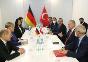 Almanya tarafında ise Başbakan Merkel’in görüşmeye davet ettiği, Almanya’da yeni koalisyon hükümetini kurmak için müzakereleri sürdüren Olaf Scholz da yer aldı.