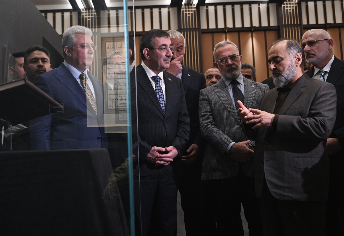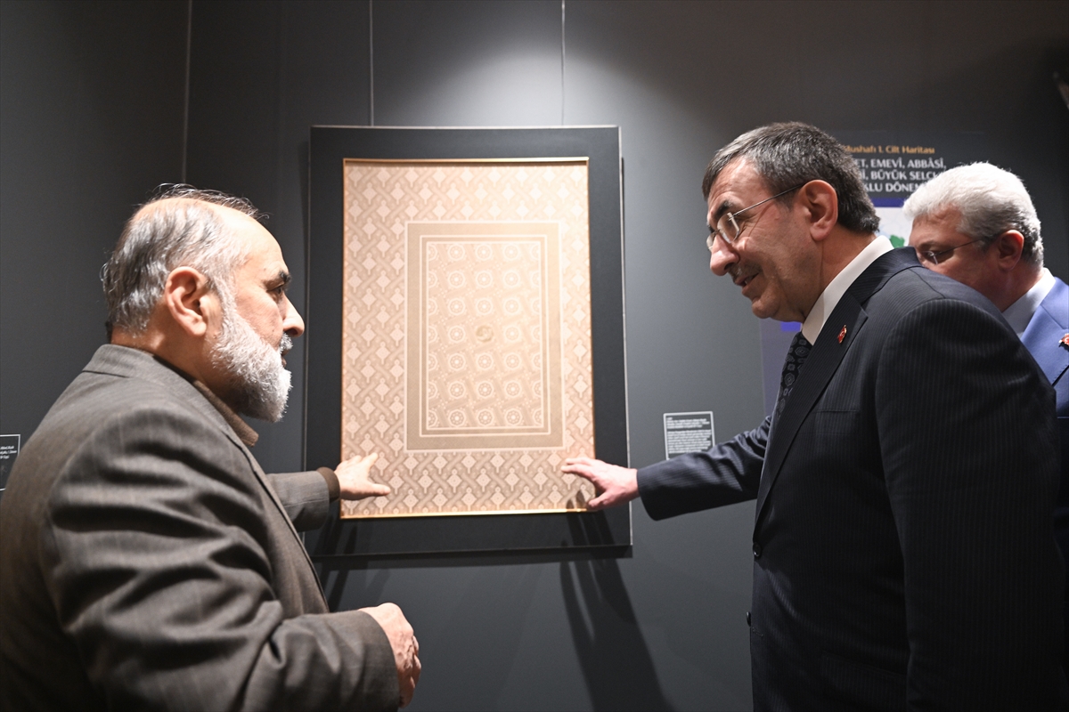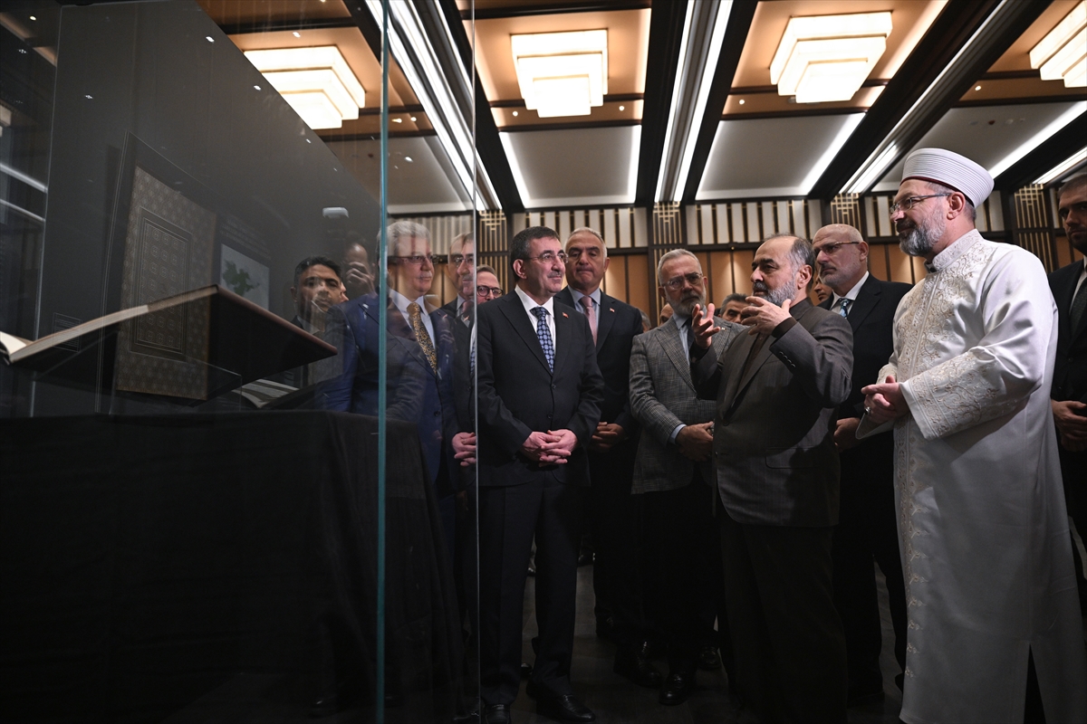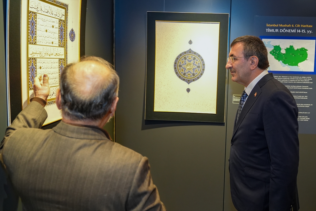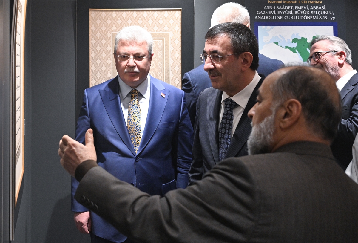 Konuşmanın ardından, Cumhurbaşkanı Yardımcısı Yılmaz, Bakan Ersoy ve beraberindekiler, Hattat Hüseyin Kutlu rehberliğinde sergiyi gezdi.