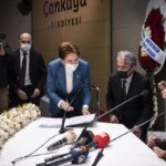 İYİ Parti Genel Başkanı Akşener, çiftin nikah şahitliğini yaptı, evlilik cüzdanını verirken çifte mutluluklar diledi.