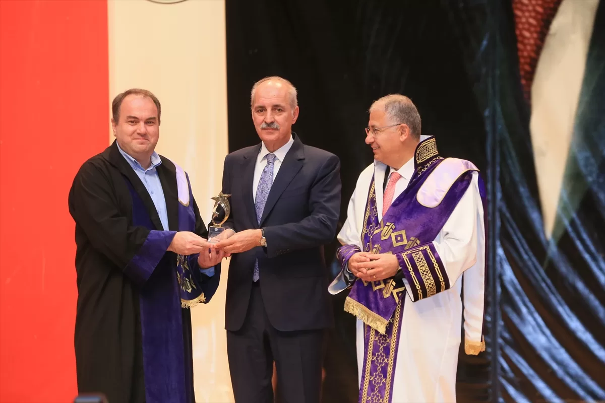 Konuşmasının ardından Kurtulmuş ve protokol üyeleri tarafından başarılı akademisyenlere plaket verildi.