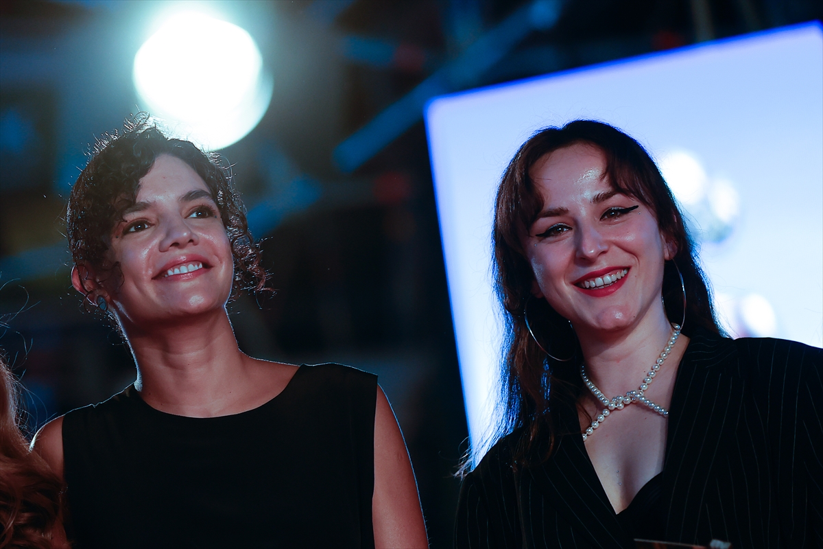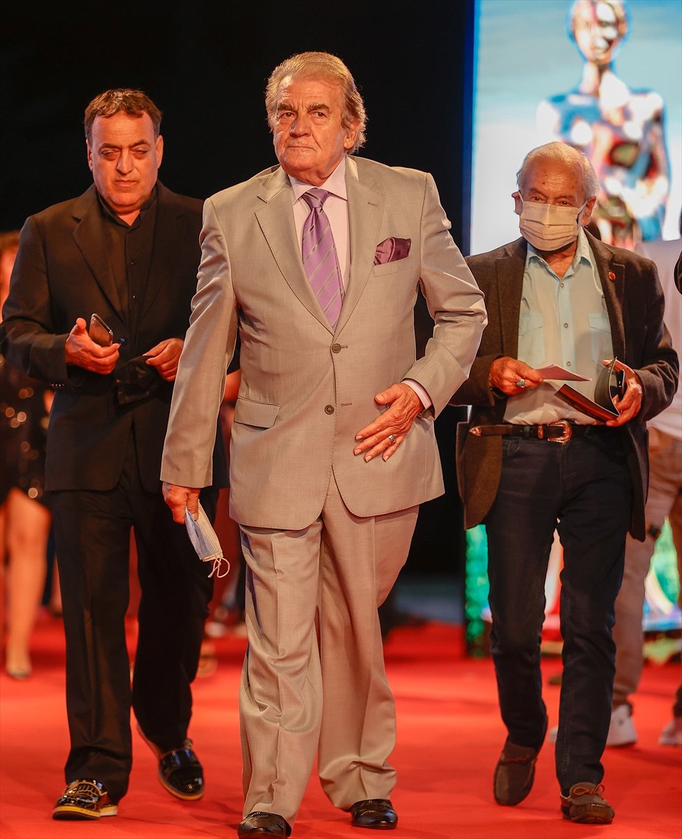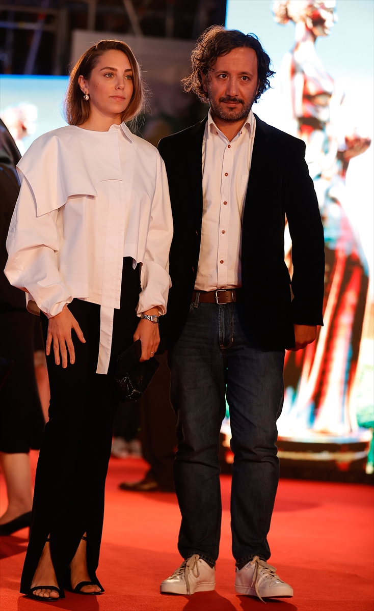 Antalya Spor Salonu'nda yeni tip koronavirüs (Kovid-19) tedbirleri altında düzenlenen festivalin açılış töreni öncesi, sinema ve televizyon dünyasının ünlü isimleri kırmızı halıda yürüyerek gazetecilere poz verdi.