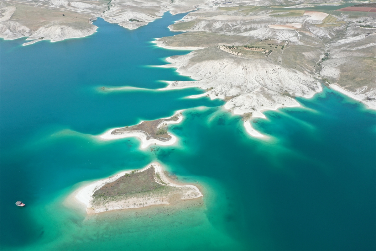 Baraj gölü içinde bulunan yükseltiler, havaların ısınması sonucu suyun azalmasıyla adacıklara dönüşüyor.