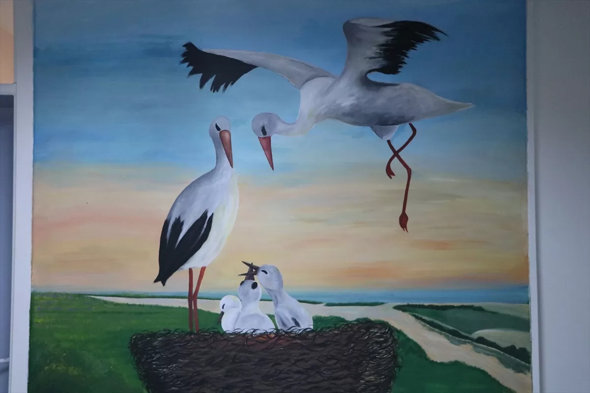 EDİRNE (AA) – GÖKHAN ZOBAR – Edirne'de bir lisenin öğrencileri okullarının önündeki direği yıllardır yuva edinen leylekleri sanat sokağı duvarına resmetti.