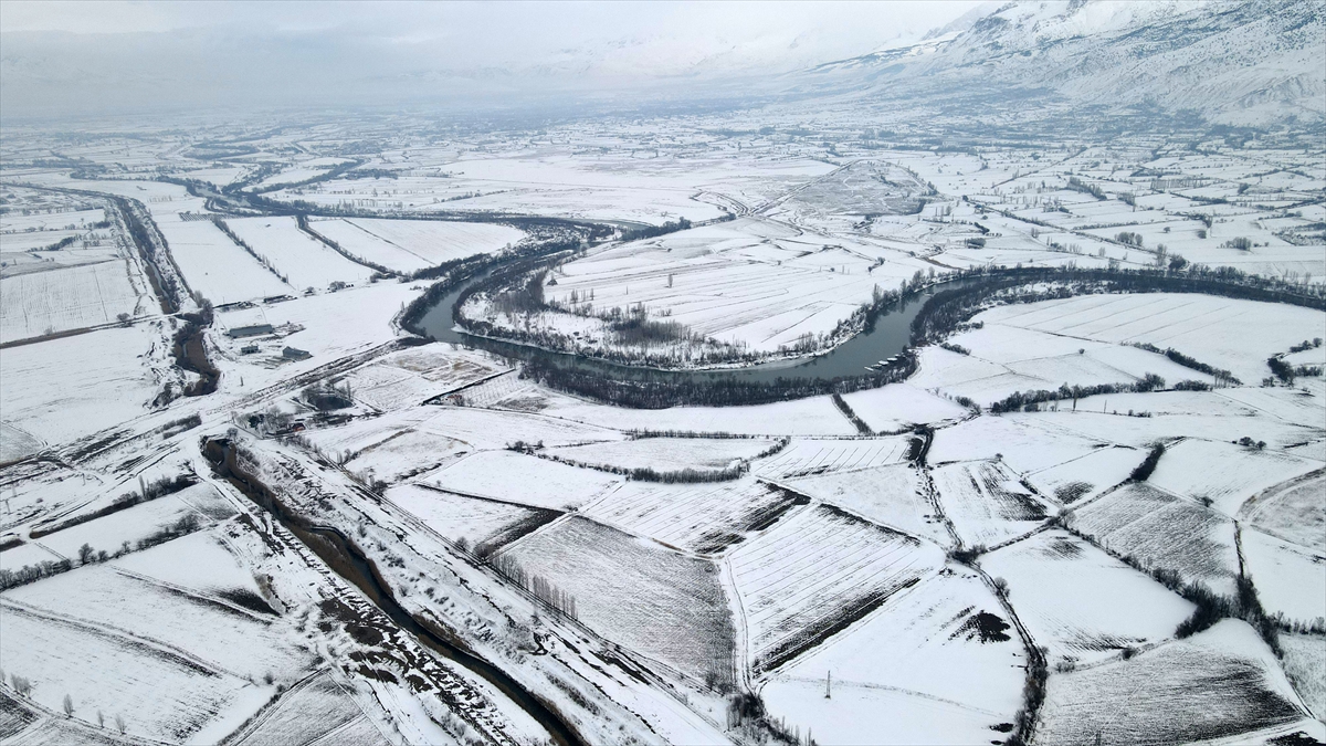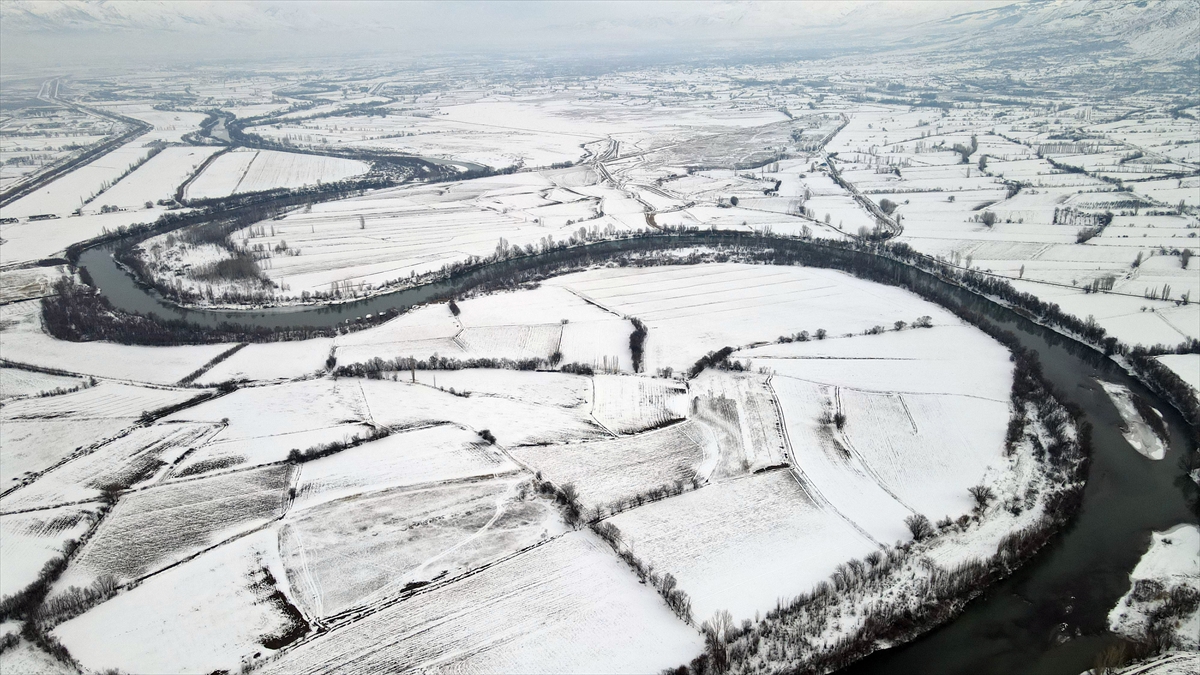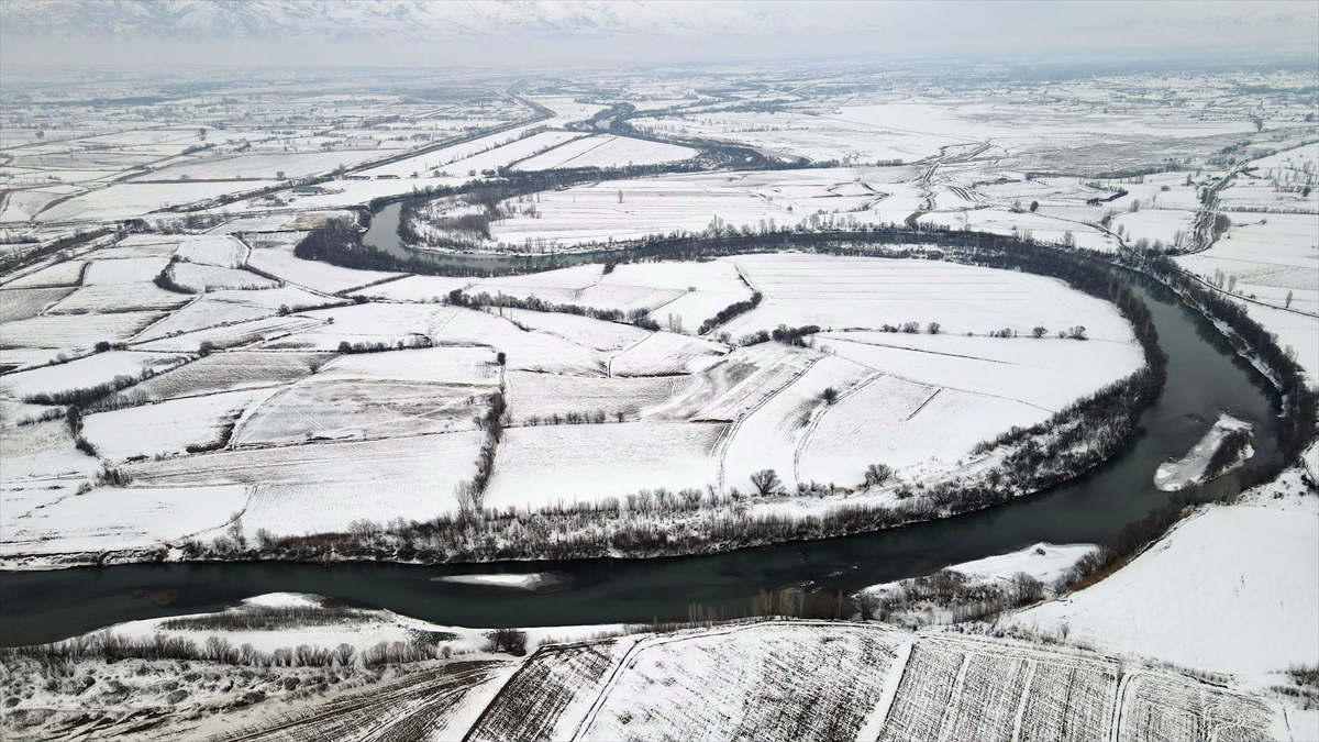 Bembeyaz kar örtüsünün arasından süzülen nehrin kıvrımlarının oluşturduğu eşsiz manzara drone ile görüntülendi.