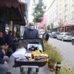 Erzurumlu 2 çocuk babası Yıldırım, 17 yıldır, bebek arabasının üzerine yerleştirdiği valizdeki çorap, gömlek, pantolon, kolonya ve maske gibi ürünleri satmak için sabah erken saatlerde kenti dolaşıyor.