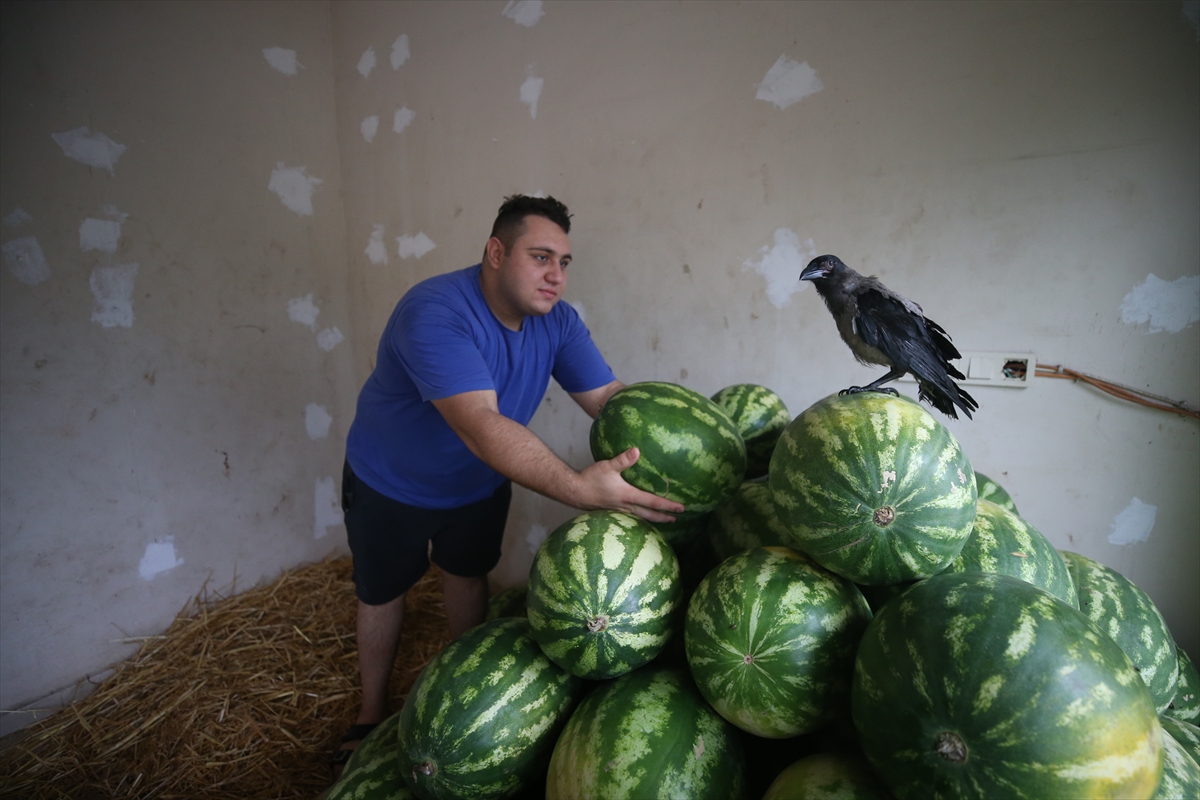 Talşık, kargayı mamanın yanı sıra manavda satışını yaptığı karpuz, kavun ve salatalık gibi ürünlerle besliyor.