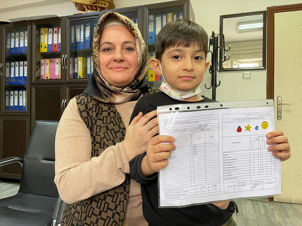 Sağlık durumunun düzelmesinin ardından okula gelen 1. sınıf öğrencisi, hayatını kurtaran öğretmeninin elinden karnesini aldı.