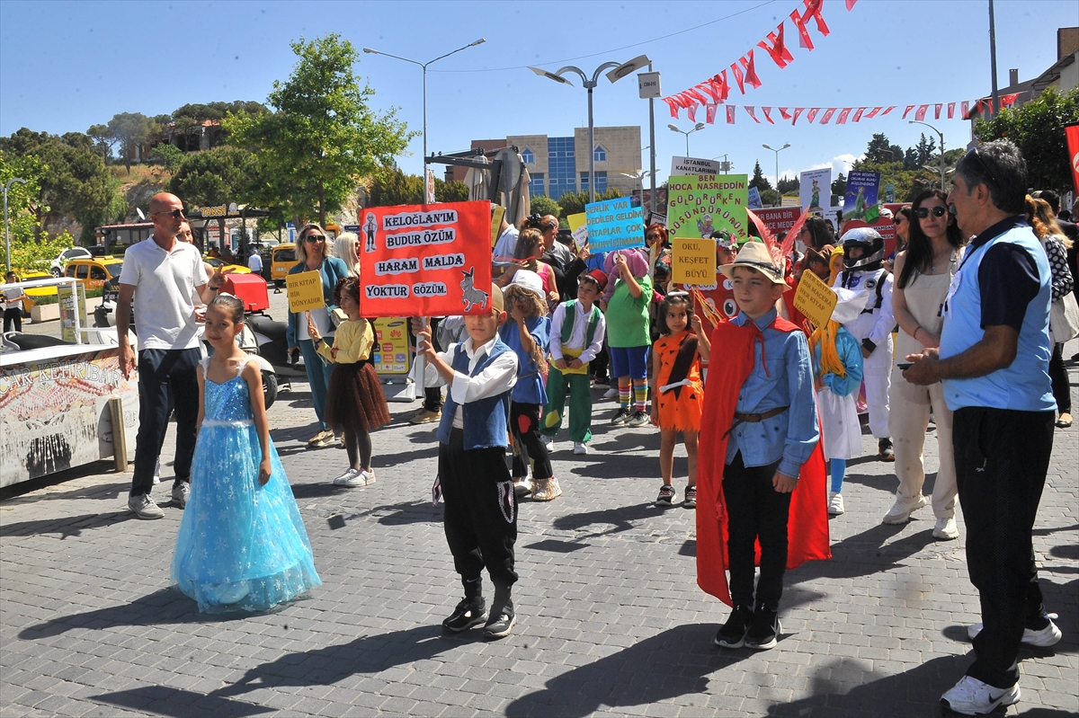 Çeşme ilçesindeki şenlik kapsamında çeşitli kitap karakterlerinin kostümlerini giyen öğrenciler, Mehmetçik Parkı'ndan Cumhuriyet Meydanı'na bando eşliğinde yürüyüş gerçekleştirdi.
