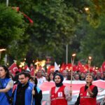 Yürüyüşe katılanlar, ellerinde Türk bayrakları ve meşalelerle bando eşliğinde yaklaşık 1 buçuk kilometre yürüyüp Misak-ı Milli Demokrasi Meydanı'na ulaştı.