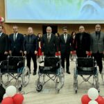 Vali Demiryürek, protokol üyeleri ile Şehit Ömer Halisdemir İlkokulu 3. sınıf öğretmeni Bilal Temel ve 26 öğrenci, tekerlekli sandalyeleri, kentteki çeşitli okullarda eğitim gören bedensel engelli öğrencilere verdi.
