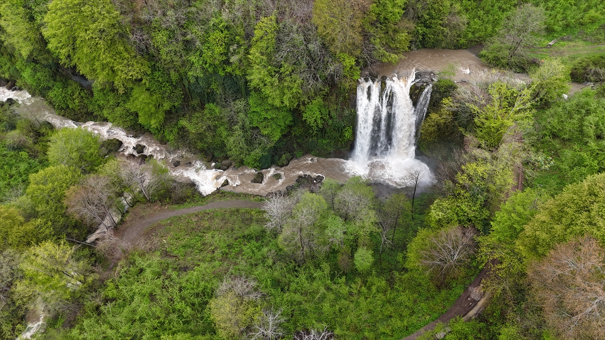 Yağış sonrası debisi yükselen şelale dronla görüntülendi.