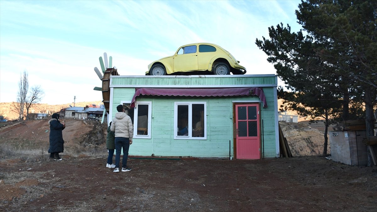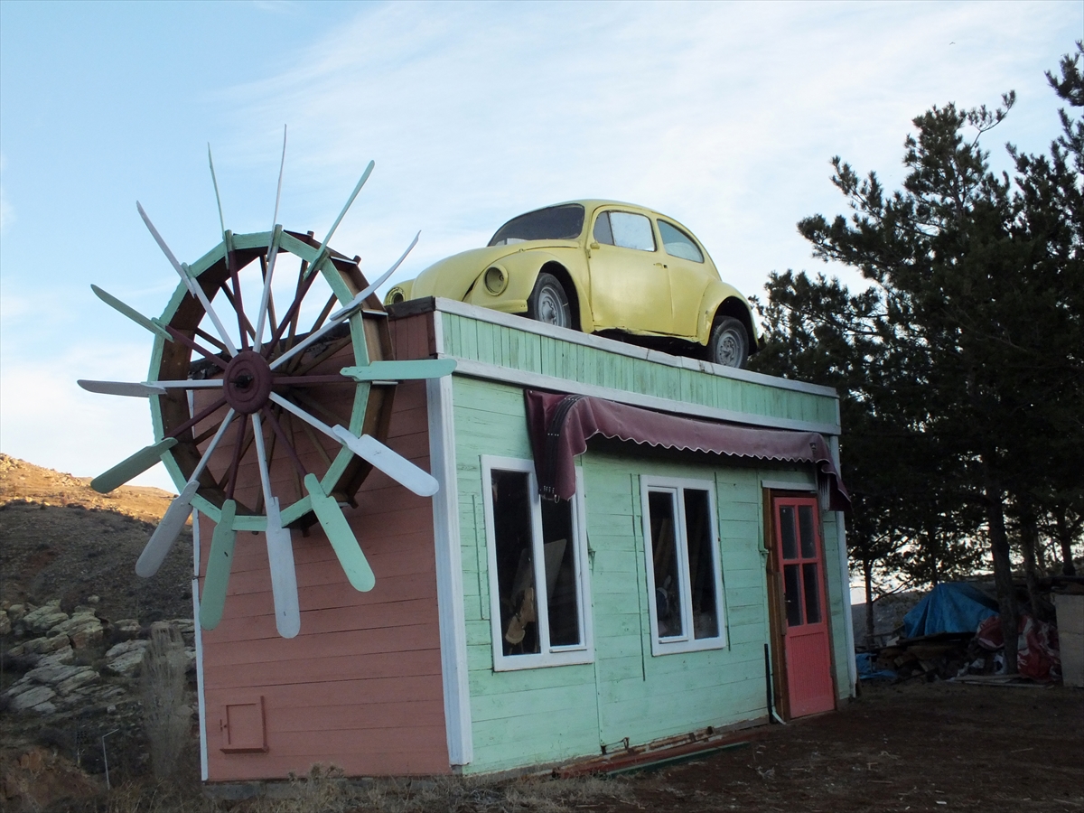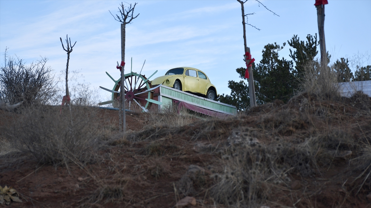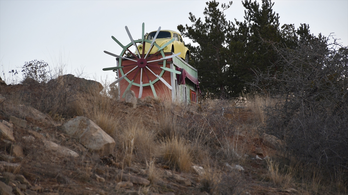 Ahşap minyatür değirmen üzerinde tepede konumlandırılan "vosvos" otomobil, kara yolundan geçenlerin dikkatini çekiyor.