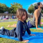 Büyüklerin ve çocukların ayrı eğitmenlerle yoga yaptığı etkinlikte, erkekler ve kadınların birlikte yoga yapması dikkati çekti.