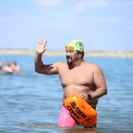 Gökçeada'daki Kuzulimanı'nda yer alan plaja çıkan 47 yaşındaki Cengiz'e, çevrede denize girenler alkışlayarak tezahüratta bulundu.