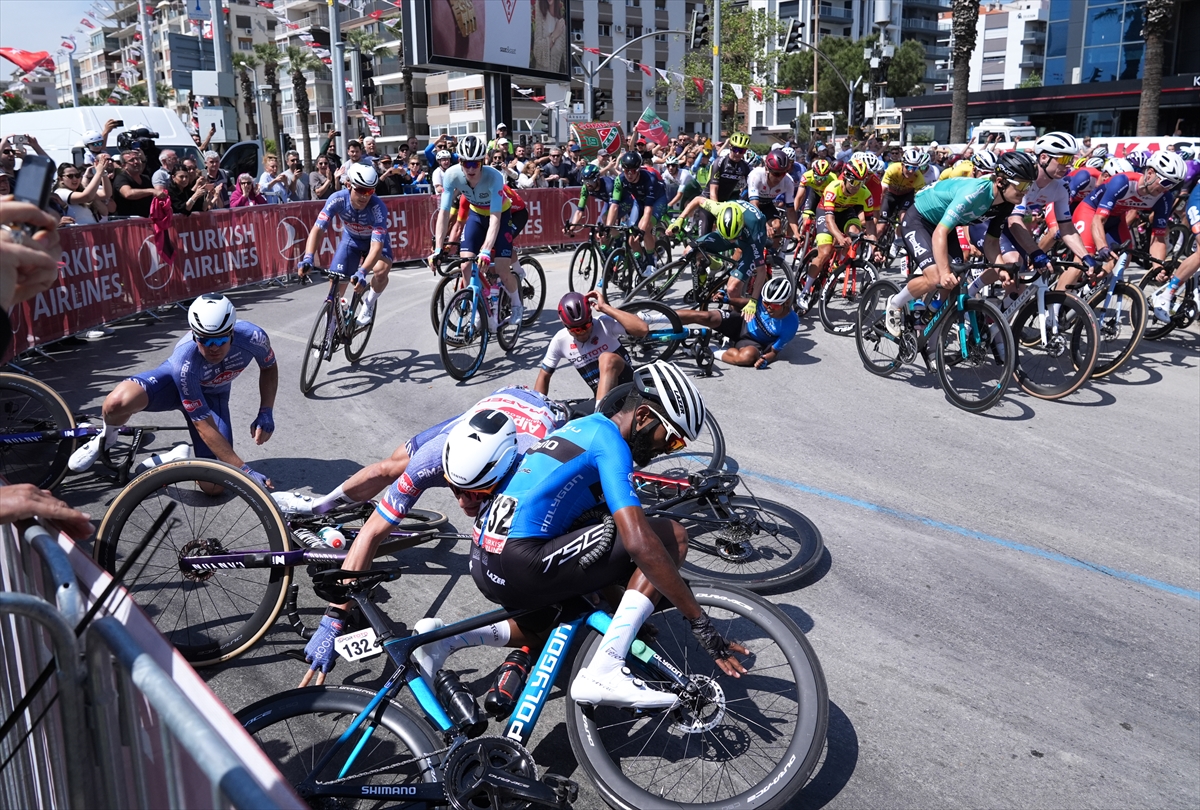 Bitiş düzlüğü öncesindeki derin virajda çok sayıda bisikletçi düştü.