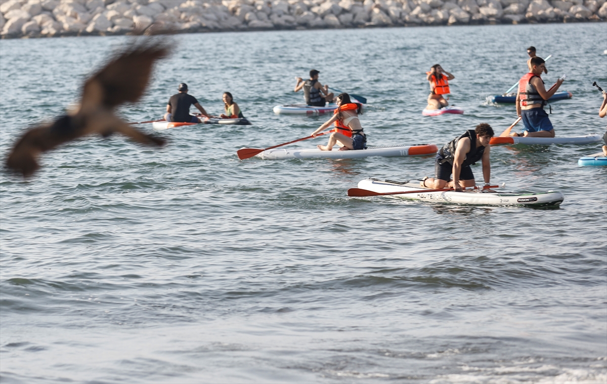 Mersin'de kürek sörfü yapmak isteyenler, sabahın ilk ışıklarıyla Adnan Menderes Bulvarı'ndaki Fenerbahçe Meydanı sahiline geliyor.