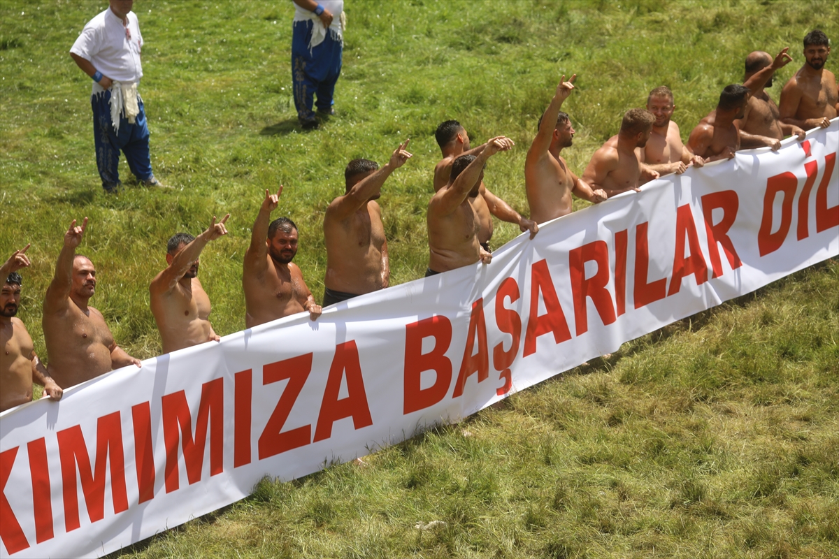 EDİRNE (AA) – 663. Tarihi Kırkpınar Yağlı Güreşleri'ne katılacak başpehlivanlar, "Bozkurt" işareti yaptı.
