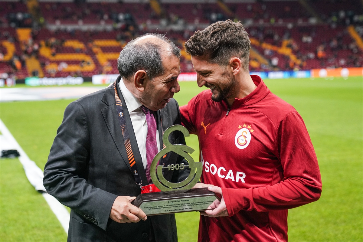 Galatasaray'ın Belçikalı yıldızı Dries Mertens'e sarı-kırmızılı formayla 100 maça çıktığı için plaket verildi.