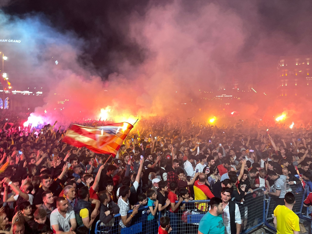 Kent meydanında maçı takip eden binlerce taraftar, meşaleler yakarak takımlarına destekte bulundu.