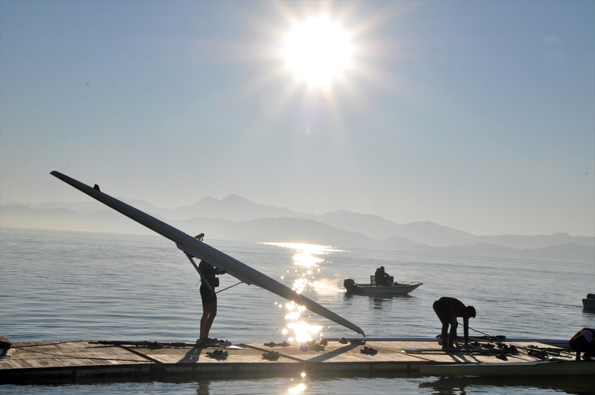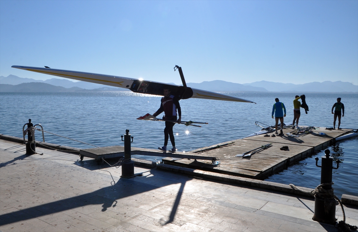 Türkiye Kürek Federasyonu tarafından Muğla'nın Köyceğiz ilçesinde düzenlenen hazırlık kampına katılan sporcular, çalışmalarını sürdürüyor. Sporcular koşu ve egzersizlerin ardından her gün Köyceğiz Gölü'nde kürek çekiyor.