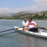 Kampı ziyaret eden Adıyaman Valisi Mahmut Çuhadar, çalışmalar hakkında bilgi alıp, sporcularla birlikte gölde kürek çekti.