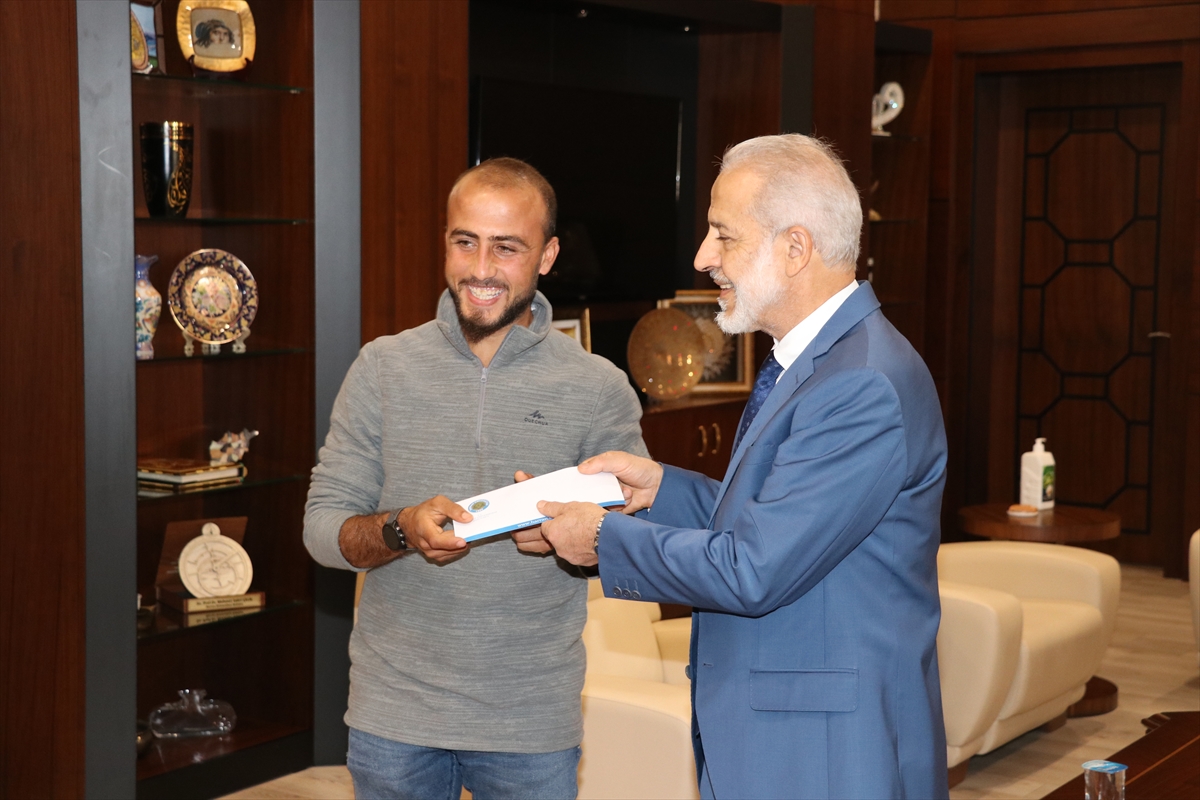 Harran Üniversitesi Beden Eğitimi ve Spor Yüksekokulu öğrencisi Abdulsamet Çevik ile milli atlet Hüseyin Can'ı makamında ağırlayan Harran Üniversitesi (HRÜ) Rektörü Prof. Dr. Mehmet Sabri Çelik, sporculardan çalışmalar hakkında bilgi aldı.