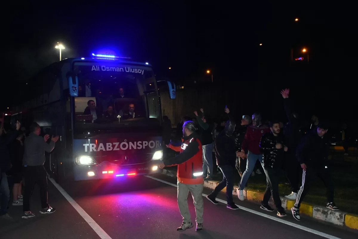 Bordo-mavili taraftarlar, maçın ardından kente gelen Trabzonspor kafilesi için Trabzon Havalimanı'nda meşale ve marşlar eşliğinde karşılama düzenledi.