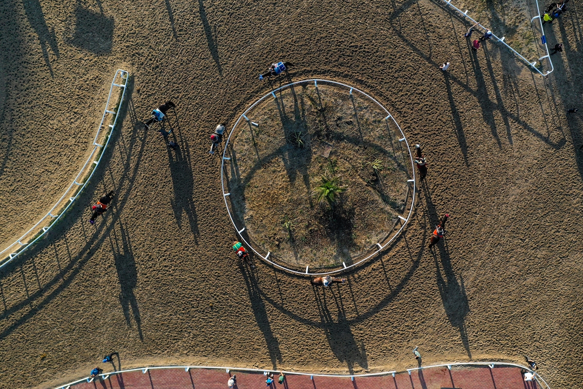 Günün saat 04.00'te başladığı Veliefendi Hipodromu'nda seyisler, antrenörler ve jokeyler hummalı bir çalışma gerçekleştiriyor. Gezinti ve koşuyla antrenman yapan atlar, temizlik ile bakımlarının ardından dinlenmeye alınıyor.