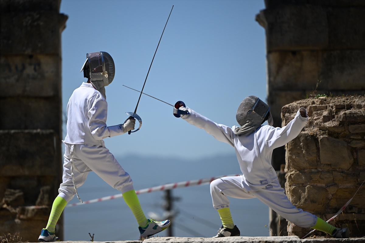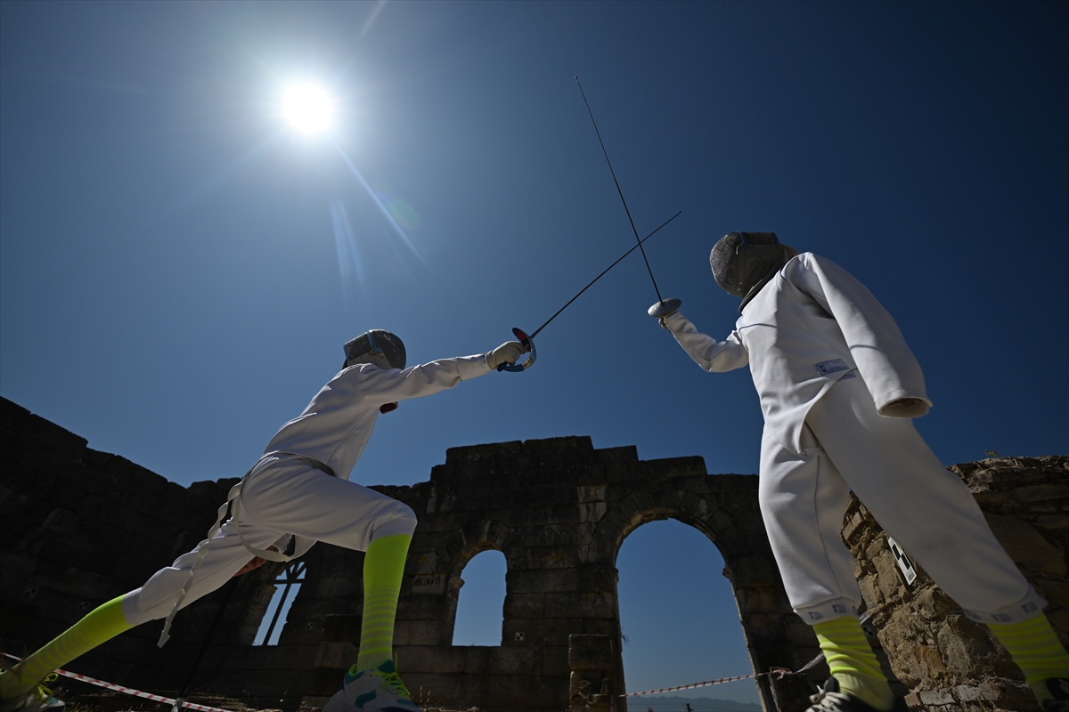Gençlik ve Spor İl Müdürlüğü eskrim antrenörü Oğuz Yıldırım eşliğinde çalışan sporcular, tarihi milattan önce 3. yüzyıla uzanan Prusias Ad Hypium Antik Kenti'nde de özel izinle zaman zaman idman yapıyor.